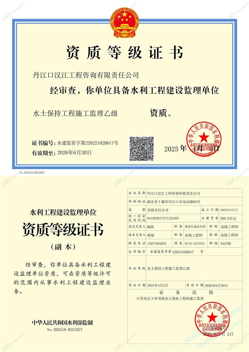 (原漢江綜合開發(fā)公司水利水電監(jiān)理中心)成立于 1989年3月,1993年6月經(jīng)水利部審批成為首批注冊監(jiān)理單位 (隸屬于長江水利委員會), 注冊資本 360萬元 。公司位于湖北省十堰市丹江口市電站路。公司目前擁有水利部頒發(fā)的 水利工程施工監(jiān)理甲級 、 水土保持工程施工監(jiān)理 乙 級 資質(zhì) ;住建部頒發(fā)的 房屋建筑 、 市政公用工程監(jiān)理 乙 級資質(zhì) 。 可獨立承擔(dān) 各類水利水電工程 、 一般工業(yè)與民用建筑工程監(jiān)理 , 土地整治 , 招標(biāo)代理 、 技術(shù)咨詢 等業(yè)務(wù)。公司實行董事會領(lǐng)導(dǎo)下的總經(jīng)理負(fù)責(zé)制,下設(shè)辦公室、經(jīng)營部、財務(wù)部、工程技術(shù)部等職能部門。……
